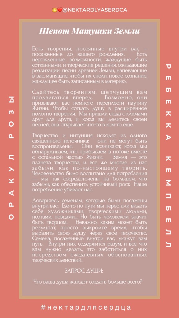 Сдайтесь творениям, шепчущим вам продвигаться вперед. Возможно, они призывают вас немного переплести паутину Жизни. Чтобы соткать душу в расширенное полотно творения. Мы пришли сюда с ключами друг для друга, и когда вы делитесь своей песней, она открывает что-то в ком-то еще.