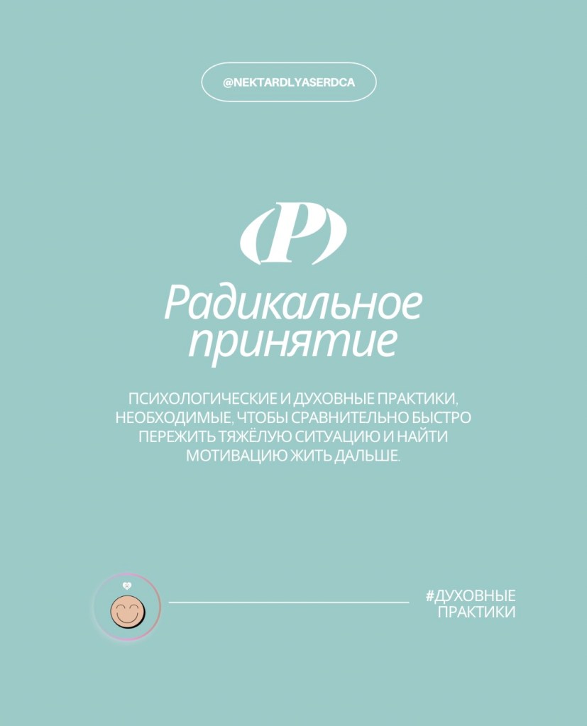 Радикальное принятие — это психологические и духовные практики, необходимые, чтобы не только пережить ситуацию и найти силы и желание жить дальше, но и сделать это осознанно, превратив «тяжелую ношу» в топливо личной эволюции индивидуального сознания.