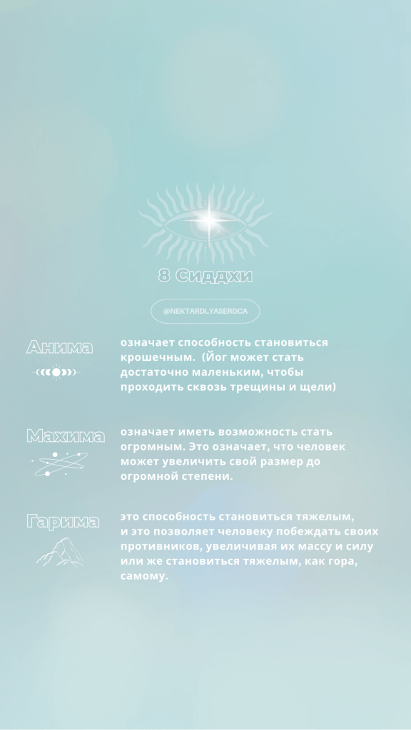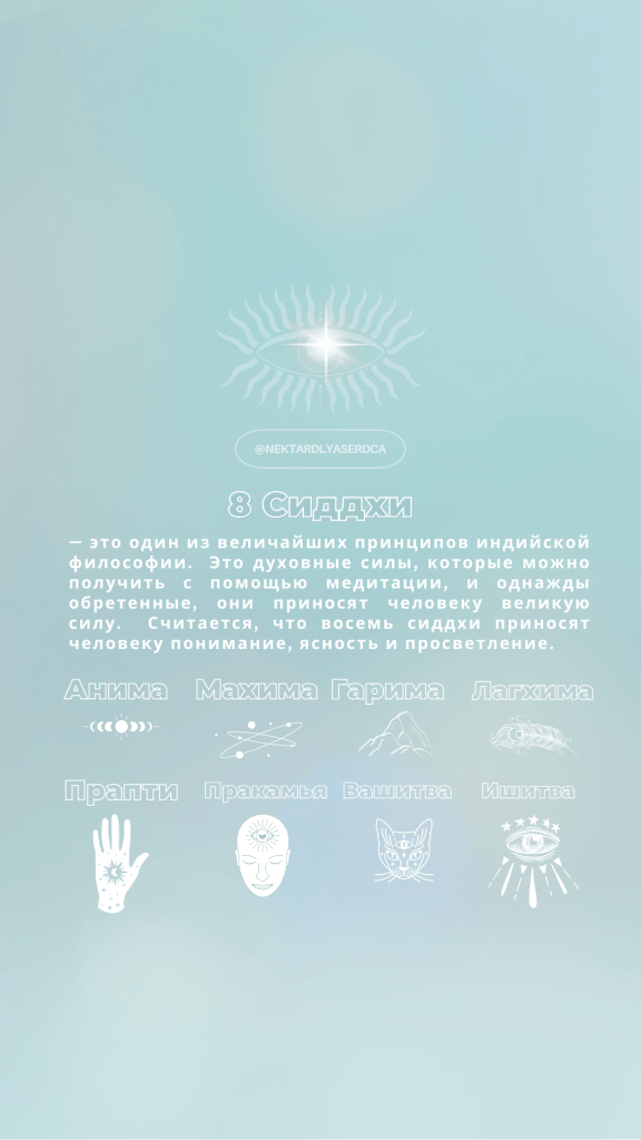 8 сиддхи — это Анима, Махима, Гарима, Лагхима, Прапти, Пракамья, Ишитва и Вашитва